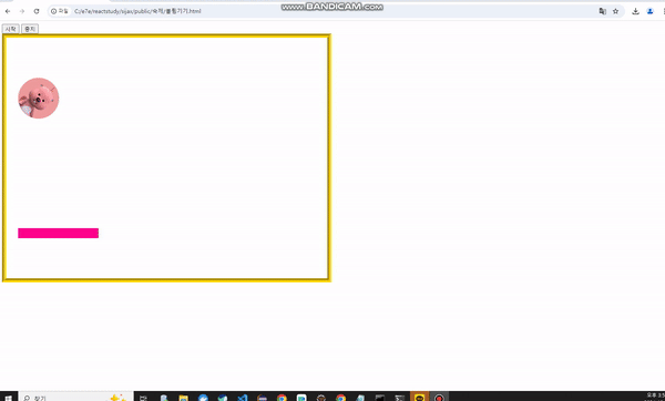 <!DOCTYPE html> <html lang="en"> <head> <meta charset="UTF-8"> <title>Document</title> <style> /*부모 relative ,자식 absolute*/ #wrapper{ position:relative; width:800px; height:600px; border:10px groove gold; } #ball{ position:absolute; width:100px; height:100px; background-color: rgb(237, 156, 156); border:1px solid rgb(237, 156, 156); border-radius: 50%; left:30px; top:10px; background-image:url("https://item.kakaocdn.net/do/a1866850b14ae47d0a2fd61f409dfc057154249a3890514a43687a85e6b6cc82"); background-size:100% 100%; transform: rotateZ(45deg); /*그냥 rotate로 하면 Z가 생략된 것임. z축 기준으로 45도 회전 rotateX, rotateY는 X축 Y축으로 45도 회전하라는 뜻. 좀 찌그러져있음 skewX(), skewY()는 X축으로 찌그러지 */ } #bar{ position:absolute; width:200px; height:25px; background-color: rgb(255, 0, 140); bottom:100px; left:100px; } </style> </head> <body> <button onclick="fStart()">시작</button> <button onclick="fStop()">중지</button> <!-- focus 받을 수 없는 것은 keyboard이벤트 안됨 해결은 tabindex=0 --> <div id="wrapper" tabindex="0" onkeydown="fkeyDown()"> <div id="ball"></div> <div id="bar"></div> </div> </body> <script> const wrapper= document.querySelector("#wrapper"); const ball = document.querySelector("#ball"); const bar = document.querySelector("#bar"); let timerId; //직접 fMove를 부르지 않고 거쳐서 감 (Proxy 대리인 패턴) let isRunning = !1; //false function fStart(){ if(!isRunning){ fMove(); isRunning = !0; //true } } function fStop(){ clearTimeout(timerId); isRunning = !1; //상태값을 시작버튼 누르기 이전으로 } function fkeyDown(){ let xSpeed = 10; let barleft = parseInt(bar.style.left); //alert(event.key); // alert(event.keyCode); if(event.keyCode==37 && barleft>0){ bar.style.left = parseInt(bar.style.left)-xSpeed+"px"; } if(event.keyCode==39 && (barleft+200) < 800){ bar.style.left = parseInt(bar.style.left)+xSpeed+"px"; } } if(!ball.style.left){ //script를 이용한 초기화 ball.style.left = "30px"; ball.style.top = "100px"; bar.style.left="30px"; } //parseInt는 문자 숫자 섞여있어도 숫자만 떼어옴(40px -> 40) //스타일은 꼭 단위를 붙여줘야 적용됨 //ball.style.left = parseInt(ball.style.left) + 50 +"px"; //인라인 스타일만 읽어올 수 있음. 근데 인라인 스타일은 권장하고있지 않기때문에 스크립트에서 위처럼 초기화해줘야함 // setTimeInterval : 주기적으로 // setTimeout: 한번만 let xSpeed = 10; //const는 상수기때문에 값을 못바꿈. let ySpeed = 10; let gakdo = 0; function fMove(){ gakdo=gakdo+10; ball.style.left = parseInt(ball.style.left) + xSpeed +"px"; ball.style.top = parseInt(ball.style.top) + ySpeed +"px"; ball.style.transform = `rotate(${gakdo}deg)`; //벽충돌 let ballLeft = parseInt(ball.style.left); let ballTop = parseInt(ball.style.top); if((ballLeft+100) >= 800 || ballLeft<=0){ //wrapper width를 800, ball width를 100으로 했기떄문 xSpeed = -xSpeed; ball.style.transform = `skewX(45deg)`; } if((ballTop+100) >= 600 || ballTop<=0){ ySpeed = -ySpeed; ball.style.transform = `skewY(45deg)`; } let barloc=parseInt(bar.style.left); if(ballTop>=375 && (ballLeft-(barloc+200)<=0) && (barloc-(ballLeft+100)<=0)){ xSpeed; ySpeed = -ySpeed; } if(ballTop==500){ clearTimeout(timerId); alert("게임 종료!"); location.reload(); } //setTimeout의 return값은 스탑워치를 가리키는 id를 리턴 timerId = setTimeout(fMove, 50); //재귀호출 } //fMove(); </script> </html>728x90'js' 카테고리의 다른 글