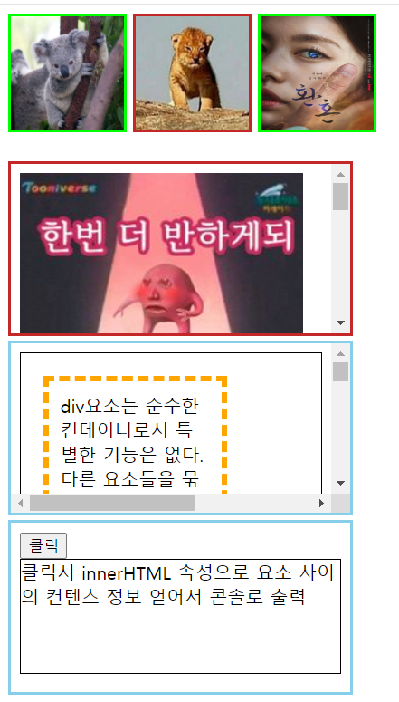 <!DOCTYPE html> <html lang="en"> <head> <meta charset="UTF-8"> <title>Document</title> <style> img{ width:100px; height:100px; } [src]{ border:3px solid skyblue; } [src^="/"]{ border-color:rgb(195, 39, 39); } [alt$=a]{ border-color:lime; } </style> </head> <body> <img src="/vscode/images/ala.jpg" alt="koala"> <img src="/vscode/images/lion.jpg" alt="lion"> <img src="/vscode/images/hh.jpg" alt="bara"> <br><br> <iframe src="/vscode/0730/img/img.html" frameborder="0" title="ifrmedia"></iframe> <iframe src="../../0731/div_span.html" frameborder="0" title="ifrm-doc"></iframe> <iframe src="../../0801/요소와정보얻기.html" frameborder="0" title="ifrm"></iframe> </body> </html>