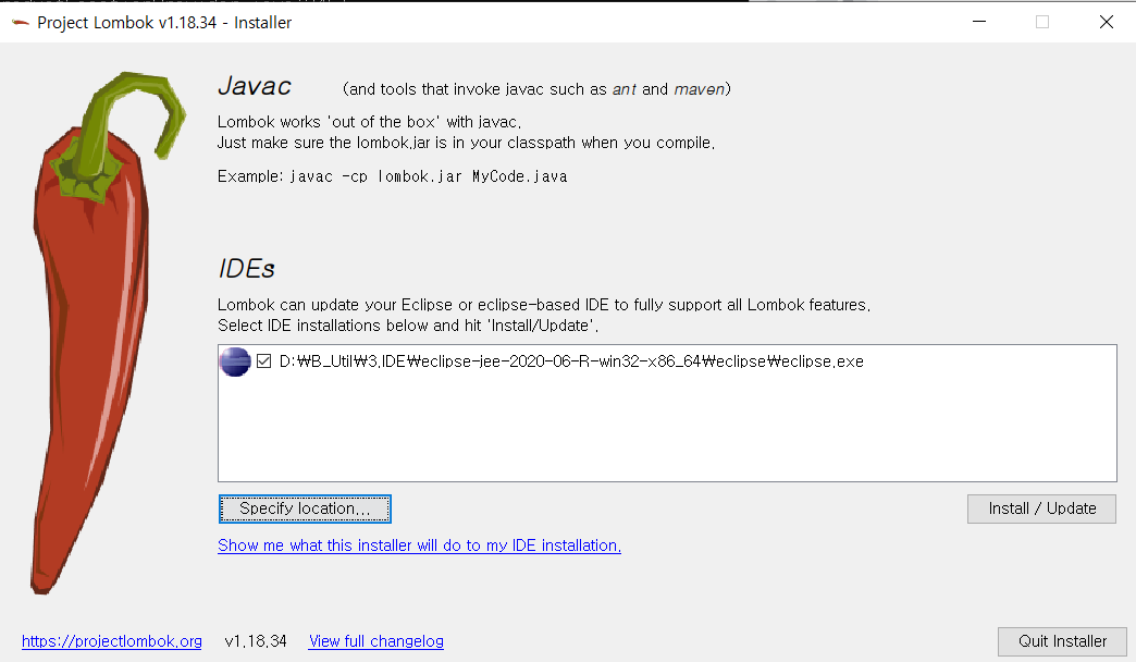 java -jar lombok.jar 입력하면