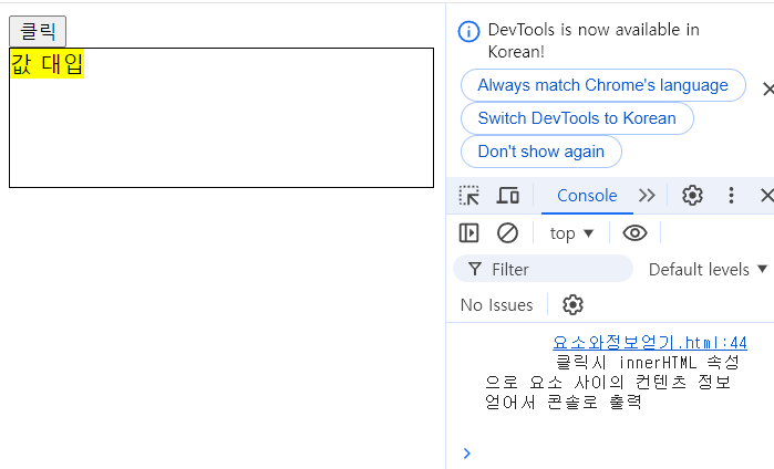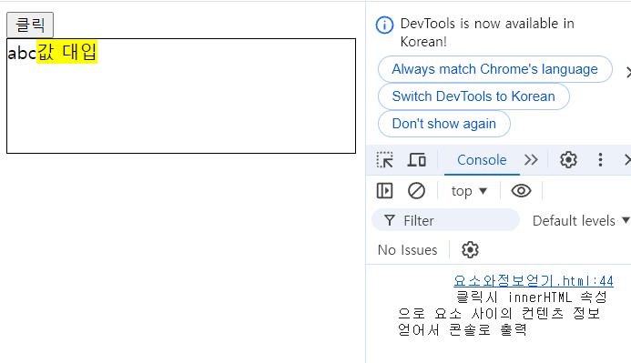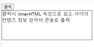 <div onclick="f_div()"> 클릭시 innerHTML 속성으로 요소 사이의 컨텐츠 정보 얻어서 콘솔로 출력 </div>function f_div(){ var v_div=document.getElementsByTagName('div')[0]; console.log(v_div.innerHTML); //대상이 되는 div요소의 내부정보를 get v_div.innerHTML = "abc"; //대상이 되는 div요소 내부공간에 값 set v_div.innerHTML="<mark>값 대입</mark>"; }