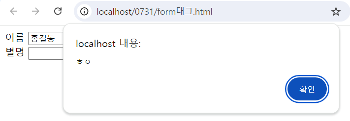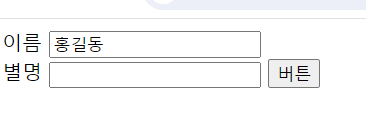 function 함수명(){ }<!DOCTYPE html> <html> <head> <meta charset="UTF-8"> <title>Insert title here</title> </head> <body> <form action="test.jsp" method="get"> 이름 <input value="홍길동" name="erum"> <br> 별명 <input name="alias"> <input type="button" value="버튼" onclick="btn()"> </form> <script> function btn(){ alert("ㅎㅇ"); } </script> </body> </html>함수 만들고