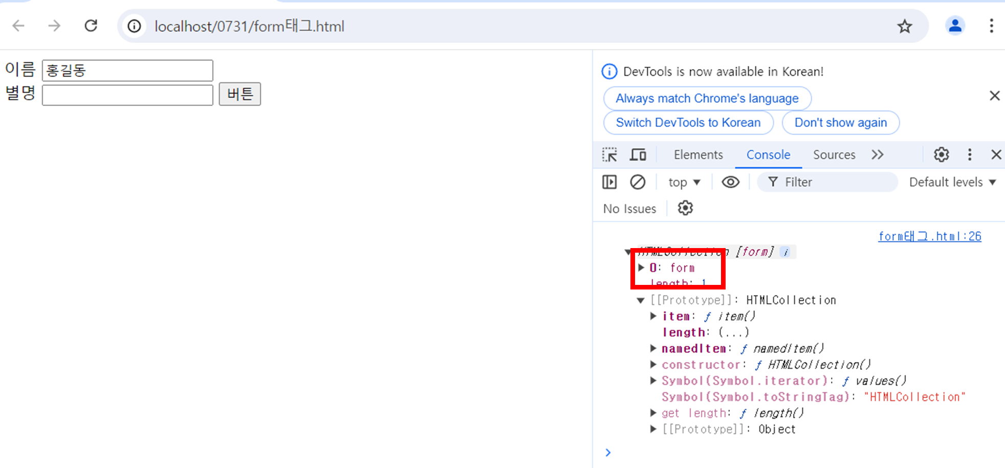 function btn(){ console.log(document.getElementsByTagName('form')); }form이라는 요소에 접근