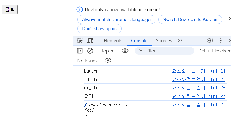 버튼 클릭하면 콘솔에 요소가 뜨는데