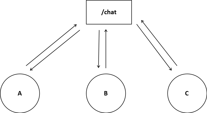 A와 B, C가 통신할 때 chat이라는 중개소를 통해 통신함 (broadcast)